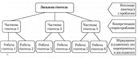 Рис. 3.1. Ієрархія гіпотез При формулюванні робочих гіпотез особливо важливо дотримуватися логічних вимог, представлених до визначення наукових понять. Передусім, необхідно звернути увагу на те, щоб обсяг і зміст понять відповідали аргументам і фактам, критеріям і ознакам, які дослідник збирається використати для доказу спроможності запропонованих ним гіпотез. Мова, на якій формулюються гіпотези, повинна бути конкретною і ясною, не містити в собі двозначностей. Якщо дослідник все ж змушений буде користуватися багатозначними термінами, у тому числі поняттями, взятими з повсякденної звичайної мови, або новими, ще недостатньо визначеними в науці термінами, то він зобов'язаний їх уточнити, перевести на загальноприйняту мову науки і визначити у відповідності з вимогами логіки їх сутність. Особливо важливими є формулювання робочих гіпотез, бо саме ці гіпотези безпосередньо перевіряються в емпіричній частині експерименту. Переконливий доказ цих гіпотез, у свою чергу, дасть підставу для затвердження правильності часткових і загальних гіпотез. Для того щоб зазначена послідовність у логіці доказу гіпотез різного рівня була дотримана, необхідно намагатися уникати типових помилок у визначенні самих робочих гіпотез. Перша з них полягає в тому, що робоча гіпотеза за обсягом і змістом понять, що входять до неї, може бути ствердженням занадто загального типу, яке є практично недоказовим при проведенні експерименту. Наприклад, ні в якому частковому експерименті неможливо ні повністю довести, ні повністю спростувати наступну робочу гіпотезу: "Мала група позитивно (негативно) впливає на студента". По-перше, малі групи можуть бути різними; по-друге, їхній вплив може бути різноманітним; по-третє, різними можуть бути і студенти, які беруть участь у дослідженні. Як у реальному житті, так і в експериментальному дослідженні можна буде легко виявити чимало як часткових підтверджень, так і спростувань запропонованої гіпотези. Друга помилка полягає в тому, що у формулюванні гіпотези можуть виявитися поняття, які неоднозначно трактуються в самій науці. Наприклад, експериментально важко буде довести наступне ствердження: "Дана програма є програмою розвиваючого навчання", бо поняття "розвиваюче навчання" в науковій літературі не має єдиного загальноприйнятого визначення. Якщо один експериментатор, що віддає перевагу якомусь визначенню, доведе, що запропонована ним навчальна програма є програмою розвиваючого навчання, то інший тут же може його спростувати, використавши таке визначення поняття "розвиваюче навчання", яке не відповідає першому. Для того щоб уникнути подібних помилок, перед початком дослідження необхідно давати робочі визначення всім багатозначним поняттям, що використовуються у формулюваннях робочих гіпотез. Тоді легко можна буде протистояти опонентам. Третя помилка, яка зустрічається в гіпотезах, полягає в тому, що в них вживаються поняття, взагалі не визначені в науці навіть у робочих варіантах. Наприклад, ствердження типу: "Впливаючи на екстрасенсорику того, хто навчається, можна добитися істотних змін в його поведінці" — не може вважатися гіпотезою наукового дослідження з тієї причини, що науці досі не відомо, що таке "екстрасенсорика", і коли це так, то залишається широке поле для самодіяльності в тлумаченні даного поня