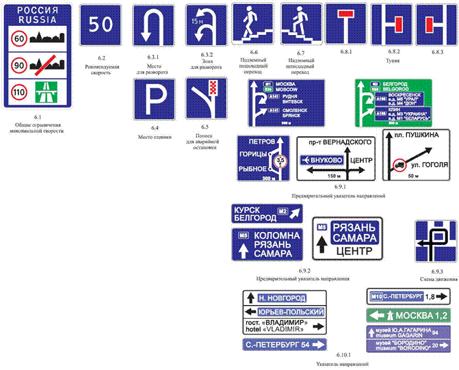 Номер и направление дороги (маршрута). Номер, присвоенный дороге (маршруту); Информационные знаки. Информационные знаки информируют о расположении населенных пунктов и других объектов, а также об установленных или о рекомендуемых режимах движения. 6.1 «Общие ограничения максимальной скорости». Общие ограничения скорости, установленные Правилами дорожного движения Российской Федерации. 6.2 «Рекомендуемая скорость». Скорость, с которой рекомендуется движение на данном участке дороги. Зона действия знака распространяется до ближайшего перекрестка, а при применении знака 6.2 совместно с предупреждающим знаком определяется протяженностью опасного участка. 6.3.1 «Место для разворота». Поворот налево запрещается. 6.3.2 «Зона для разворота». Протяженность зоны для разворота. Поворот налево запрещается. 6.4 «Парковка (парковочное место)». 6.5 «Полоса аварийной остановки». Полоса аварийной остановки на крутом спуске. 6.6 «Подземный пешеходный переход». 6.7 «Надземный пешеходный переход». 6.8.1 - 6.8.3 «Тупик». Дорога, не имеющая сквозного проезда. 6.9.1 «Предварительный указатель направлений», 6.9.2 «Предварительный указатель направления». Направления движения к обозначенным на знаке населенным пунктам и другим объектам. На знаках могут быть нанесены изображения знака 6.14.1, символы автомагистрали, аэропорта и иные пиктограммы. На знаке 6.9.1 могут быть нанесены изображения других знаков, информирующих об особенностях движения. В нижней части знака 6.9.1 указывается расстояние от места установки знака до перекрестка или начала полосы торможения. Знак 6.9.1 применяется также для указания объезда участков дорог, на которых установлен один из запрещающих знаков 3.11 - 3.15. 6.9.3 «Схема движения». Маршрут движения при запрещении на перекрестке отдельных маневров или разрешенные направления движения на сложном перекрестке. 6.10.1 «Указатель направлений», 6.10.2»Указатель направления». Направления движения к пунктам маршрута. На знаках может быть указано расстояние (км) до обозначенных на них объектов, нанесены символы автомагистрали, аэропорта и иные пиктограммы. 6.11 «Наименование объекта». Наименование иного объекта, чем населенный пункт (река, озеро, перевал, достопримечательность и тому подобное). 6.12 «Указатель расстояний». Расстояние (км) до населенных пунктов, расположенных на маршруте. 6.13 «Километровый знак». Расстояние (км) до начала или конца дороги. 6.14.1, 6.14.2»Номер маршрута». 6.15.1 - 6.15.3 «Направление движения для грузовых автомобилей». Рекомендуемое направление движения для грузовых автомобилей, тракторов и самоходных машин, если на перекрестке их движение в одном из направлений запрещено. 6.16 «Стоп-линия». Место остановки транспортных средств при запрещающем сигнале светофора (регулировщика). 6.17 «Схема объезда». Маршрут объезда участка дороги, временно закрытого для движения. 6.18.1 - 6.18.3 «Направление объезда». Направление объезда участка дороги, временно закрытого для движения. 6.19.1, 6.19.2 «Предварительный указатель перестроения на другую проезжую часть». Направление объезда закрытого для движения участка проезжей части на дороге с разделительной полосой или направление движения для возвращения на правую проезжую часть. 6.20.1, 6.20.2 «Аварийный выход». Указывает место в тоннеле, где находится аварийный выход. 6.21.1, 6.21.2 «Направление движения к аварийному выходу