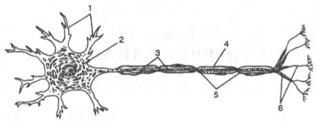 Рис. 19.1. Строение нейрона (схема по Шмитту). 1 - дендриты; 2 - тело нейрона; 3 - аксон; 4 - миелиновая оболочка; 5 - перехваты узла; 6 - окончания. Важный компонент цитоплазмы нейрона – пластинчатый комплекс (аппарат Гольджи), где сосредоточены главным образом липидные компоненты клетки. Одной из особенностей митохондрий, изолированных из нервных клеток, является то, что они содержат меньше ферментов, участвующих в процессах окисления жирных кислот и аминокислот, чем митохондрии из других тканей. В ЦНС лизосомы обнаруживаются постоянно и выполняют те же функции, что и лизосомы других органов тканей. Размер ядра нейрона колеблется от 3 до 18 мкм, достигая в крупных нейронах 1/4 величины их тела.