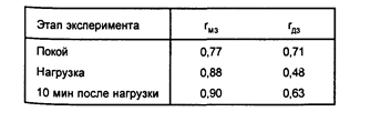 При анализе деятельности сердечно-сосудистой системы при физической нагрузке авторами были выявлены похожие закономерности. Исследование Д.Бумсма с соавторами (Boomsma D. et al., 1992), выполненное на большой выборке близнецов (160 пар в возрасте от 14 до 21 года), показало, что у женщин при нагрузках (задачи на время реакции и решение задач) увеличивалась оценка наследуемости уровня как систолического, так и диастолического давления, в то время как у мужчин данная тенденция наблюдалась только для систолического давления. Диастолическое давление мужчин при нагрузках контролировалось генотипом даже в меньшей степени, чем в покое. Для систолического давления у женщин и мужчин и для диастолического давления у женщин наблюдалось также влияние систематической среды, уменьшающееся при функциональных нагрузках. Частота сердечно-сосудистых сокращений (ЧСС). Анализ ЧСС в исследовании Е.И.Соколова и коллег (1980) показал, что в состоянии покоя сходство монозиготных близнецов лишь ненамного превышает сходство дизиготных, тогда как при нагрузке сходство МЗ заметно увеличивается, а сходство дизиготных близнецов уменьшается (таблица 3), что говорит об увеличении коэффициента наследуемости. Таблица 3 Внутриклассовые корреляции показателей ЧСС при эмоциональной нагрузке (по Соколову Е.И. и др., 1980)