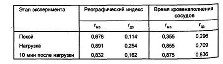 Авторы полагают, что более интенсивное функционирование сердечно-сосудистой системы при нагрузке, компенсируя возрастающие потребности тканей в кислороде, в первую очередь обеспечивает потребности центральной нервной системы. Действительно, уровень кровенаполнения сосудов головного мозга во время эмоционального напряжения несколько возрастает, а во время отдыха снижается. Оказалось, что в состоянии покоя для величин реографического индекса характерен определенный вклад генетических факторов в их вариативность, однако влияние генотипа значительно увеличивается во время нагрузки и уменьшается после 10-минутного отдыха. Анализ времени кровенаполнения сосудов показал, что в состоянии покоя изменчивость этого показателя обусловлена средовыми факторами, а во время нагрузки — наследственными (таблица 4). Таблица 4 Внутриклассовые корреляции показателей реографического индекса и времени кровенаполнения сосудов (по Соколову Е.И. и др.. 1980)