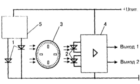 Оптические датчики положения коленчатого вала ДВС. Для получения информации о частоте вращения коленчатого вала двигателя и его положения применяют и оптические датчики. Их принцип действия основан на периодическом прерывании маркерным диском светового потока, создаваемого излучателем (светодиодом) в инфракрасном диапазоне волн и регистрации изменении этого потока приемником (фотодиодом). После усиления и формирования в микросхеме получается электрический импульсный сигнал. Как правило используются двухканальные оптические датчики выходные сигналы которого приведены на рис.3.1., а структурная схема на рис.32..