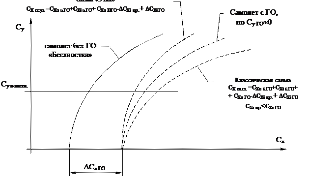 Направление силы в полете как правило такое, как на схеме, но не ГО может быть и положительная сила. Необходимость увеличения подъемной силы крыла сверх G приводит к дополнительному индуктивному сопротивлению, а, следовательно, к потере аэродинамического качества (К) на балансировку. Эти потери еще увеличиваются за счет СХi ГО.
