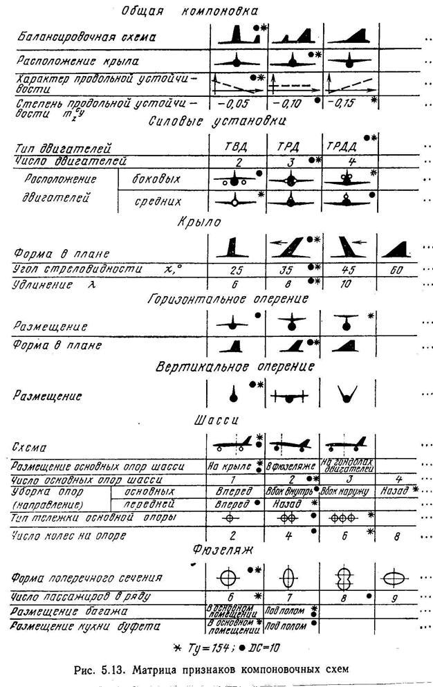 При реальном проектном анализе количественная оценка компоновочных схем должна быть заменена количественной. Для этого все свойства схем должны быть сведены к одному показателю (например, к весу самолета) при прочих равных условиях. Более подробный анализ схем по перечисленным признакам будет дан при рассмотрении отдельных агрегатов. Систематизировать выбор схемы самолета по отдельным признакам позволяет матрица признаков компоновочных схем (МПКС), обобщающая опыт проектирования самолетов данного класса.