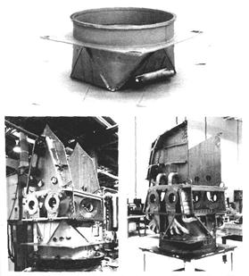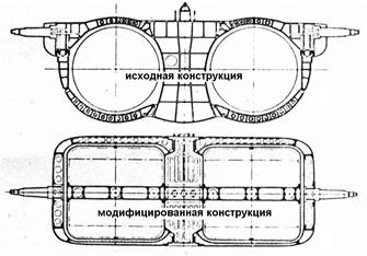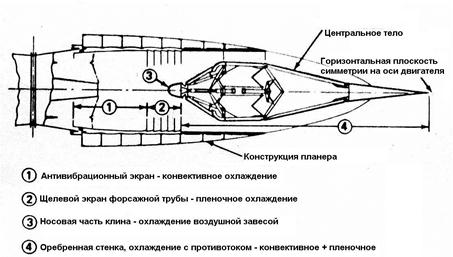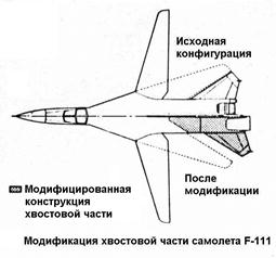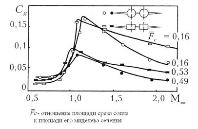 Одним из достоинств плоских сопел является возможность обеспечения их многофункциональности при меньшем, чем у осесимметричных сопел количестве конструктивных элементов: регулирование проходных сечений сопла, отклонение вектора тяги и реверсирование тяги могут обеспечиваться одними и теми же элементами, что приводит к экономии веса. Конфигурация такого сопла на основных режимах работы иллюстрируется рисунком 2-20 [8]. Представляет интерес особенность использования направляющих лопаток, размещенных на поверхности самолета. Помимо реверсирования тяги они обеспечивают отклонение вектора тяги относительно продольной оси сопла на режиме прямой тяги, что позволяет при заходе на посадку иметь малую реактивную силу, действующую в продольном направлении. После касания поверхности ВПП максимальная реверсированная тяга обеспечивается путем перекладки направляющих лопаток за время, существенно меньшее, чем при традиционном законе перехода с режима прямой тяги на режим реверса. Хвостовая часть самолета, оснащенного плоскими соплами, имеет большую омываемую поверхность, чем при осесимметричных соплах, что в первую очередь связано с б¢ольшим периметром прямоугольника при равной с кругом площади (рис.2-21), причем это соотношение зависит от формы прямоугольника (отношения ширины b к высоте h). Некоторое представление о влиянии особенностей конфигурации хвостовой части сверхзвукового самолета на коэффициент ее сопротивления дает рис. 2-22 [2]. При дозвуковых скоростях полета сопротивление плоских сопел несколько меньше, чем осесимметричных, что связано главным образом с более благоприятным их сочетанием с сужающимся к хвосту фюзеляжем самолета. При сверхзвуковых скоростях, когда влияние краевых эффектов уменьшается, течение становится близким к плоскому на значительной части поверхности сопел, и их сопротивление превышает сопротивление осесимметричных сопел. Возможности использования особенностей плоского сопла в компоновке спарки сопел иллюстрирует проект доработки хвостовой части самолета Дженерал Дайнемикс F-111. В этом проекте рассматривался вариант с включением (интеграцией) плоского сопла с клиновидным центральным телом в конструкцию хвостовой части самолета (рис. 2-23…2-25) [7]. Вариант традиционной (то есть консольной) установки сопла на двигателе требует соответствующих весовых изменений как для двигателя, так и для конструкции плоской форсажной трубы. Экраны форсажной трубы должны поддерживаться внутри их собственных наддутых гондол, имеющих частично некруглое сечение, требующее особой конструкции, чтобы сохранить «квадратную» форму канала и поддерживать клиновидное центральное тело. Веса оболочки двигателя и его подвески должны быть увеличены, чтобы воспринимать маневренные нагрузки более тяжелого консольного сопла, а также уравновешивать нагрузки при отклонении вектора тяги (ОВТ). В таблице на рис.2-24 приводится результат весового анализа двух вариантов сопел в размерности двигателя Практт-Уитни TF-30. Схема сопла, объединенного с фюзеляжем, хорошо подходит для компоновок с двумя близко расположенными двигателями. При этом кормовая часть проектируется как единая конструкция, чтобы поддерживать единую наддутую оболочку форсажной камеры, сохранять форму прямоугольного канала и уравновешивать нагрузк
