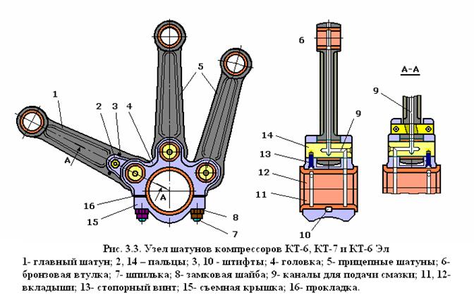Главный шатун выполнен из двух частей – собственно шатуна 1 и разъемной головки 4, жестко соединенных между собой пальцем 2 со штифтом 3 и пальцем 14. В верхние головки шатунов запрессованы бронзовые втулки 6. Съемная крышка 15 прикреплена к головке 4 четырьмя шпильками 7, гайки которой стопорятся замковой шайбой 8. В расточке головки 4 главного шатуна установлены два стальных вкладыша 11 и 12, залитые баббитом. Вкладыши удерживаются в головке за счет натяга и стопорения штифтом 10. Зазор между шейкой вала и подшипником шатуна регулируется прокладками 16. Каналы 9 служат для подачи смазки к верхним головкам шатунов и к поршневым пальцам. Основным преимуществом данной системы шатунов является значительное уменьшение износа вкладышей и шатунной шейки коленчатого вала, которое обеспечивается передачей усилий от поршней через головку сразу на всю поверхность шейки. Поршни 2 и 5 (рис. 3.2.) – литые чугунные. Они присоединяются к верхним головкам шатунов поршневыми пальцами 30 плавающего типа. Для предотвращения осевого перемещения пальцев поршни снабжены стопорными кольцами. Поршневые пальцы ЦНД – стальные, пустотелые, поршневые пальцы ЦВД сплошные. На каждом поршне установлены по четыре поршневых кольца: два верхних – компрессионные (уплотнительные), два нижних – маслосъемные. Кольца имеют радиальные пазы для прохода масла, снятого с зеркала цилиндра. Клапанные коробки внутренней перегородкой разделены на две полости: всасывающую (В) и нагнетательную (Н). (Рис.3.4.).