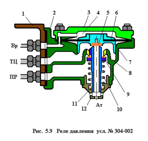 Реле давления усл. № 304 (Рис.5.9) состоит из кронштейна 1, корпуса 2, крышки 3 и цоколя 12 с атмосферными отверстиями. Между корпусом и крышкой установлена резиновая диафрагма 6, на которой закреплен алюминиевый стакан 7. Полость 4 над диафрагмой называется управляющей камерой реле. На дне стакана винтом закреплена резиновая шайба 5, которая является выпускным клапаном. В нижней части корпуса расположен питательный клапан 9 со сквозным осевым каналом диаметром 8 мм. Питательный клапан пружиной 10 прижимается к седлу 8 и в цоколе уплотнен манжетой 11.При торможении воздухораспределитель наполняет сжатым воздухом управляющую камеру реле. При этом диафрагма 6 прогибается вниз и стакан 7 отжимает от седла питательный клапан 9, который начинает пропускать воздух из питательного резервуара в полость под диафрагмой и далее в канал ТЦ. После стабилизации давления в управляющей камере реле наполнение ТЦ продолжается до момента равновесия на диафрагме 6 усилия сжатого воздуха со стороны ВР и усилия сжатого воздуха со стороны ТЦ и пружины 10. Однако, поскольку сжатый воздух со стороны ТЦ действует не только на диафрагму, но и на сам питательный клапан, давление воздуха в управляющей камере реле будет несколько выше, чем в полости под диафрагмой. Эта разность давлений будет тем больше, чем меньше давление воздуха в управляющей камере реле, и может изменяться в пределах от 0,1 до 0,3 кгс/см2. При ступенчатом повышении давления в управляющей камере реле давление в ТЦ возрастает также ступенями. При отпуске воздухораспределитель выпускает воздух из управляющей камеры реле в атмосферу. Давлением ТЦ диафрагма 6 прогибается вверх и выпускной клапан 5 открывает осевой канал в питательном клапане 9, через который сжатый воздух из ТЦ выходит в атмосферу. Отпуск можно производить как ступенчатый, так и полный, понижая давление воздуха в управляющей камере реле соответственно либо ступенями, либо за один прием до атмосферного давления. Наряду с реле давления усл.№ 304-002 на подвижном составе в настоящее время применяют реле давления усл.№ 404. Это реле давления имеет увеличенный диаметр осевого канала питательного клапана (11 мм вместо 8 мм), другую форму посадочной поверхности питательного клапана (треугольник вместо диска) и седла питательного клапана и менее жесткую пружину. Указанные конструктивные изменения позволяют с большей точностью поддерживать в ТЦ требуемое давление во всем рабочем диапазоне давлений (разность давлений в управляющей камере реле и в ТЦ не превышает 0,1 кгс/см2) и ускорить опорожнение ТЦ при отпуске.