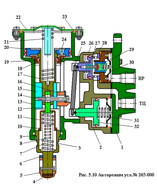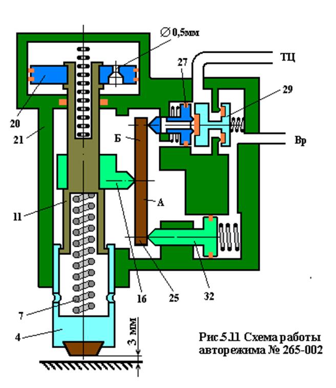 При торможении сжатый воздух из ЗР через воздухораспределитель поступает к двухседельчатому клапану 29 и в полость справа от нижнего поршня 32, заставляя последний перемещаться влево. Рычаг 25 при этом поворачивается на сухаре по часовой стрелке, перемещая верхний поршень 27 и двухседельчатый клапан вправо. Клапан 29 отжимается от седла и начинает пропускать воздух из ЗР в ТЦ. По мере роста давления в ТЦ увеличивается усилие на рычаг со стороны верхнего поршня, который начинает перемещаться влево, поворачивая рычаг против часовой стрелки. Рычаг 25 займет исходное положение при равенстве моментов сил относительно сухаря. При этом двухседельчатый клапан закроется своей пружиной, прекращая проход воздуха из ЗР в ТЦ. В случае снижения давления в ТЦ из-за утечек сжатого воздуха нарушается равновесие моментов сил на поршнях пневматического реле авторежима. В этом случае рычаг поворачивается по часовой стрелке, отжимая от седла двухседельчатый клапан, который начинает пропускать воздух из ЗР в ТЦ, восстанавливая равенство моментов сил относительно точки опоры рычага. При срабатывании воздухораспределителя на отпуск понижается давление в полости справа от нижнего поршня 32. Давлением ТЦ верхний поршень 27 перемещается влево, поворачивая рычаг против часовой стрелки, и двухседельчатый клапан открывает атмосферный канал в штоке поршня, через который воздух из ТЦ выходит в атмосферу. Вертикальные колебания вагона не сказываются на работе авторежима. Так при толчке кузова или тележки вверх поперечная балка сжимает пружины 7 и 8, стремясь переместить демпферный поршень вверх, но этому препятствует пружина 21 и воздух в полости над поршнем. При толчке вниз поперечная балка опускается, усилие пружин 7 и 8 уменьшается и пружина 21 стремится переместить демпферный поршень вниз, но этому препятствует воздух в полости под поршнем. Таким образом, в процессе движения вагона демпферный поршень занимает некоторое равновесное положение в соответствии с загрузкой вагона и его колебания незначительны. В процессе загрузки или разгрузки вагона воздух успевает перетекать из одной полости в другую через дроссельное отверстие диаметром 0,5 мм в диске демпферного поршня, и последний занимает положение, соответствующее прогибу рессор, то есть загрузке вагона. Регулировка авторежима осуществляется на порожнем вагоне путем свинчивания гайки 5 с упором 4 до касания с опорной плитой (а также постановкой или изъятием металлических прокладок, закрепляемых на опорной плите). На порожнем вагоне допускается наличие зазора не более 3 мм между упором авторежима и опорной плитой, причем кольцевая выточка на вилке должна выходить из корпуса не величину не менее 2 мм. На груженом вагоне зазор между упором авторежима и опорной плитой не допускается и кольцевая выточка на вилке должна быть полностью утоплена в корпусе демпферной части
