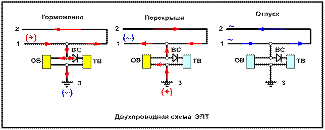 Отпуск тормоза осуществляется снятием напряжения постоянного тока с линейных проводов. Одновременно с этим в рабочий провод 1 подается напряжение переменного тока, однако вентили ОВ и ТВ остаются невозбужденными вследствие их большого индуктивного сопротивления. Контроль целостности рабочего провода 1 осуществляется непрерывно с помощью контрольного провода 2 переменным током при отпускном и поездном положениях ручки крана машиниста и постоянным током в положениях перекрыши и торможения.