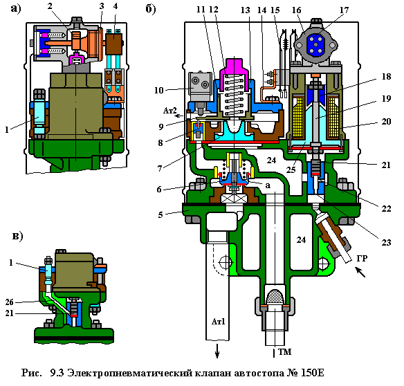 На подвижном составе используются электропневматические клапаны автостопа ЭПК № 150Е и № 150И (рис. 9.3.) ЭПК имеет кронштейн 5, к которому присоединены трубопроводы от ГР и ТМ, а также атмосферная труба Ат1. В этом же кронштейне расположена камера 24 выдержки времени объемом 1 л. На верхней части кронштейна смонтированы все узлы ЭПК. Электромагнит ЭПК состоит из катушки 20 с сердечником 25 и якорем 18. С якорем жестко соединен шток 19, нижняя часть которого представляет собой плунжер (клапан) 21. Полость плунжера каналом 26 может сообщаться со свистком 1. На электромагните установлен корпус 16 замка ЭПК, в котором находятся эксцентрик 4 с осью 2, проходящей через крышку 3. На крышке 13 с помощью скобы 14 укреплена контактная группа 15, замыкание и размыкание контактов которой осуществляется эксцентриком 4. Эта контактная группа обеспечивает регистрацию на скоростемерной ленте состояние автостопа (включенное или выключенное). Камера выдержки времени снабжена резиновой диафрагмой 7, на которую сверху через стакан 11 действует регулировочная пружина 12. Стакан имеет рычаг 9, с помощью которого он может воздействовать на атмосферный клапан 8 и концевой выключатель 10. Под диафрагмой расположен нагруженный пружиной срывной клапан 6 с калиброванным отверстием «а» диаметром 0,8 мм.