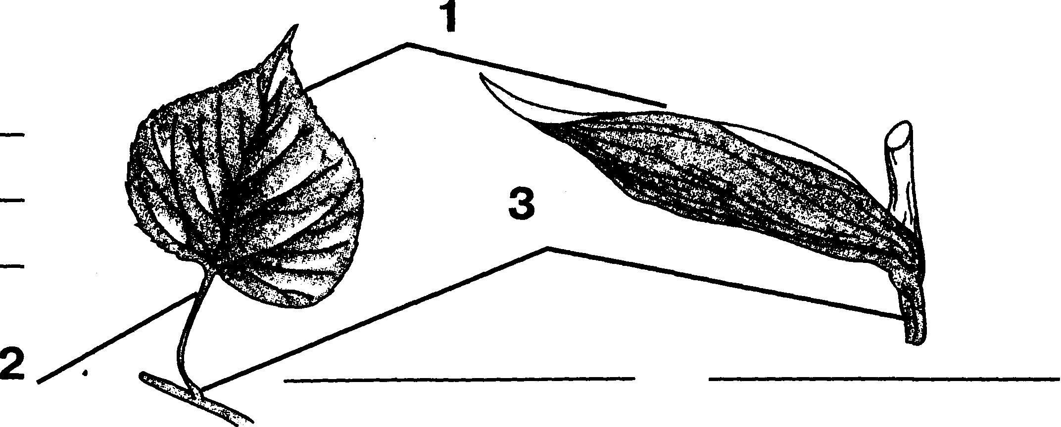 а) Визначте назву кожного листка відповідно до наявності черешка. б) Порівняйте натуральні об'єкти з малюнком. Запишіть, якими цифрами позначено листкову пластинку, черешок, основу. Під малюнком впишіть назву листка в залежності від наявності черешка.
