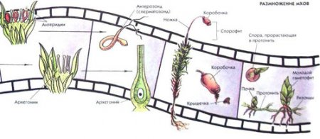 Запліднення відбувається в плівці води, яка виникає після дощу або після конденсації туману чи роси. Із зиготи на жіночій особині формується спорофіт у вигляді коричневої коробочки на ніжці. Коробочка на час дозрівання спор закрита кришечкою, яка захищає їх від можливого проникнення води. Ніжка занурена в тканини верхівкової частини стебла. Всередині зрілої коробочки є пристосувальний механізм для висипання зрілих спор — ряд зубчиків, які закривають вхід до коробочки. За сприятливих умов вони відгинаються і спори розносяться вітром. Мохи і печіночники можуть розмножуватися вегетативним способом. За сприятливих умов із стебла, листка або ризоїда здатна розвинутися нова рослина.