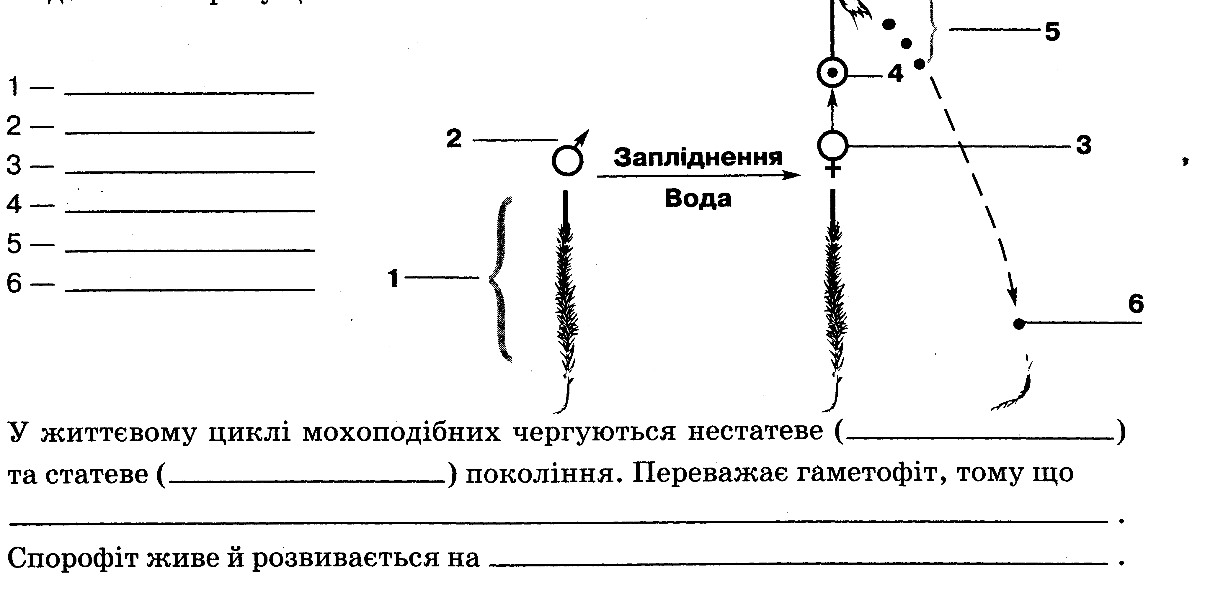 2. Розгляньте шматочки дернини зозулиного льону. Знайдіть у нього ризоїди, стебло і листя. Запишіть, якими цифрами позначено на малюнку ризоїди і стебло з листками. На верхівці листка моху знайдіть спорогон, що складається з довгої, тонкої ніжки й коробочки. Запишіть, якими цифрами позначено на малюнку ніжку і коробочку. Укажіть, яке пристосування є для захисту спор. 3. На схемі цифрами позначені складові частини життєвого циклу зозулиного льону. Використовуючи підручник, перелічіть їх на схемі. В описі життєвого циклу допишіть пропущені поняття та пояснення.