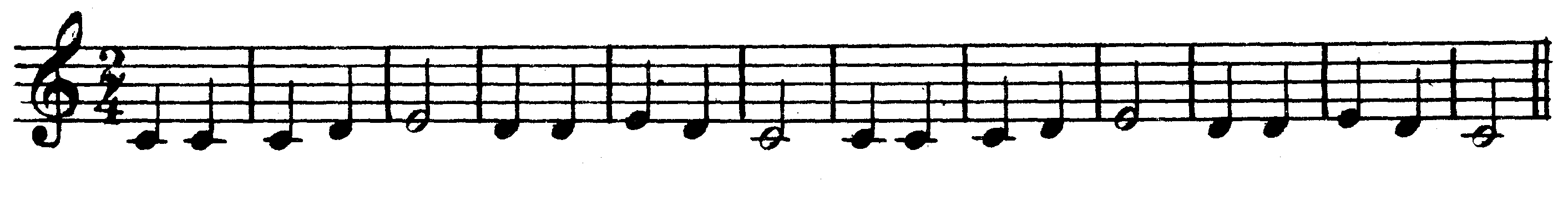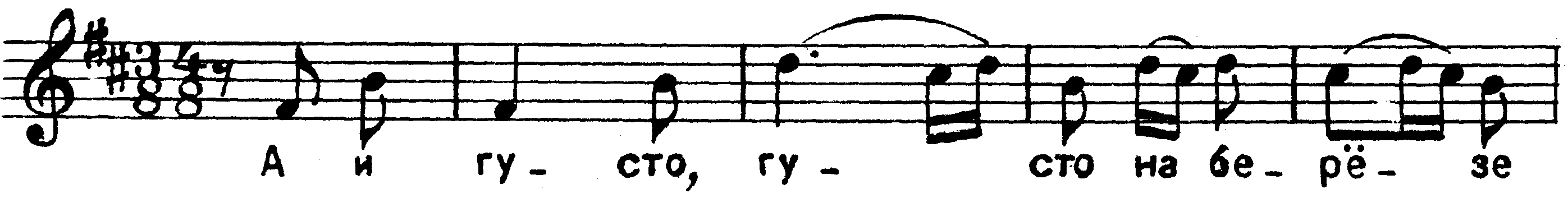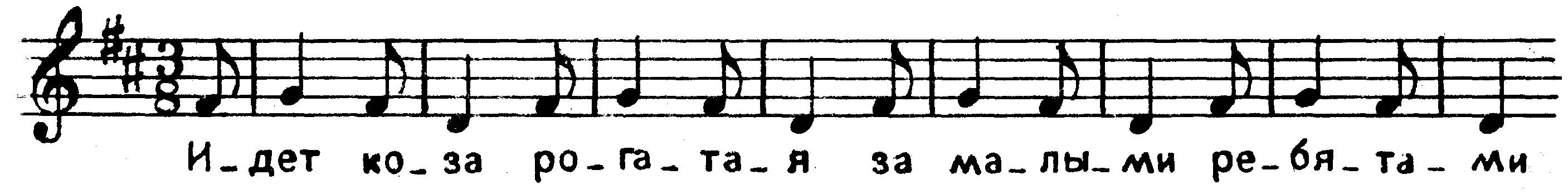 Другие неполные диатонические ладовые образования могут включать в себя еще меньшее число звуков. Так, например, звукоряд лада русской народной песни «Идет коза рогатая» состоит всего из трех звуков: 156 В этом примере ладовая основа ограничена тоникой, III и IV ступенями. Ладовый звукоряд следующей песни тоже ограничен тремя ступенями — тоникой, II и III: 157 Русская песня «Ходит зайка серенький»