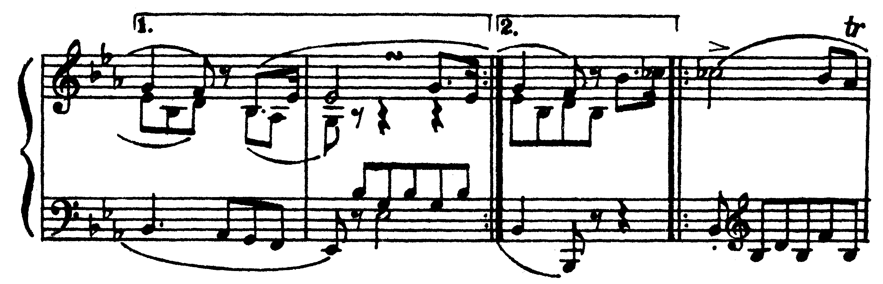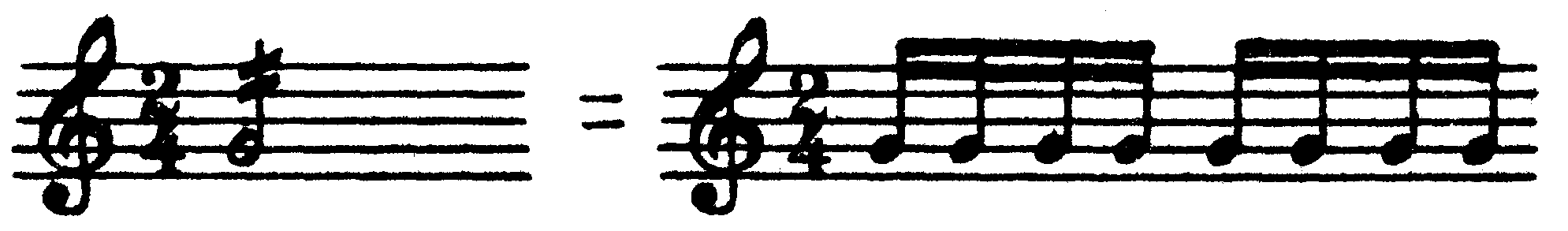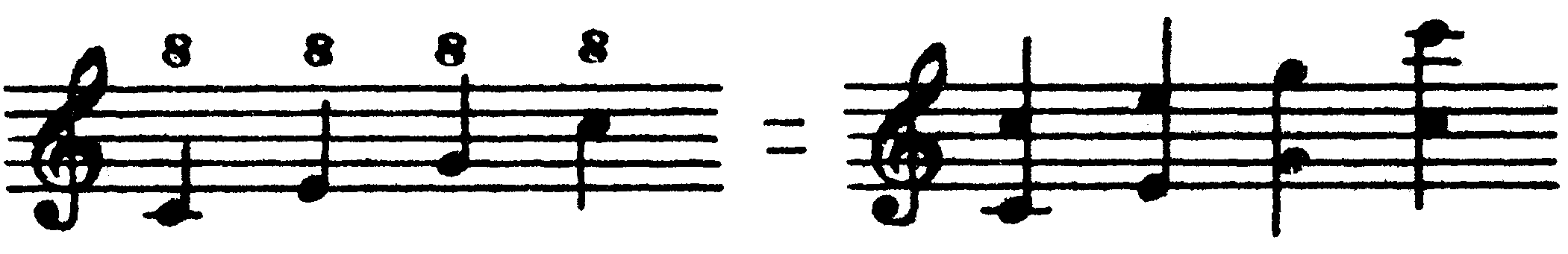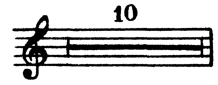 В приведенном примере при повторении вместо тактов, отмеченных первой вольтой, исполняется то, что отмечено второй вольтой, после чего следует развитие (см. последний такт и далее). Второй из вышеприведенных знаков повторения ( Следующий знак указывает на необходимость многократного повторения отдельного звука или аккорда: 356 Повторение двух звуков, при многократном и быстром чередовании образующее тремоло, обозначается следующим образом: 357 Удвоение в октаву обозначается цифрой 8, ставящейся над или под нотой (в зависимости от того, будет ли производиться удвоение в верхнюю или нижнюю октаву): 358 Необходимость исполнения относительно протяженной мелодической линии (или партии какого-либо другого голоса) октавой выше или ниже обозначается цифрой 8, поставленной над или под нотоносцем, и пунктирной линией, идущей от цифры до того места, где исполнение октавой выше или ниже заканчивается: 359 Многотактовая пауза (например, в оркестровых партиях) обычно — для экономии места — обозначается одним тактом, внутри которого находится горизонтальная черта, ограниченная по краям вертикальными черточками, с проставленной цифрой, указывающей количество пропускаемых (то есть паузируемых) тактов: 360 ОГЛАВЛЕНИЕ