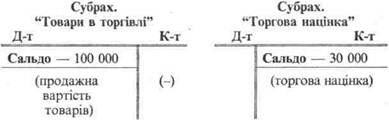 З наведеного прикладу видно, що залишкова вартість основних засобів на звітну дату дорівнює сумі 170 000 грн. (200 000 - 30 000). Таким чином, регулюючий субрахунок "Знос основних засобів" дає змогу здійснювати облік основних засобів на рахунку "Основні засоби" за первинною вартістю і мати інформацію про їх залишкову вартість. Обидві оцінки основних засобів потрібні для управління діяльністю підприємства. Так, облік основних засобів за первинною вартістю потрібен для контролю за їх збереженням, для нарахування амортизації, ви- значення фондовіддачі тощо. Інформація про залишкову вартість основних засобів потрібна як показник реальної їх цінності на звітну дату. Аналогічну функцію виконують також субрахунки "Знос інших необоротних матеріальних активів" (до рахунка "Інші необоротні матеріальні активи") і "Знос нематеріальних активів" (до рахунка "Нематеріальні активи"). Субрахунок "Торгова націнка" торговими підприємствами використовується у тому випадку, коли облік товарів на субрахунку "Товари в торгівлі" (роздрібні торгові підприємства) ведеться за продажними цінами. Для визначення купівельної (реальної) вартості залишку товарів на звітну дату з їх вартості за продажними цінами (дебетове сальдо субрахунка "Товари в торгівлі") вираховують суму торгової націнки (кредитове сальдо регулюючого субрахунка "Торгова націнка"). В бухгалтерському обліку такі дані матимуть вигляд: