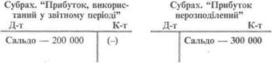 Пояснення: Ж — первинна оцінка об'єктів господарських засобів; З — сума, що зменшує оцінку об'єктів; І — фактична (реальна) вартість об'єктів. З наведеної схеми видно, що кредитовий залишок регулюючого контрактивного рахунка показує, на яку суму повинна бути зменшена оцінка залишку, відображеного на основному рахунку (що регулюється), щоб мати уяву про реальну вартість об'єкта. Регулюючі контрпасивні рахунки призначені для уточнення суми залишків окремих джерел засобів, облік яких ведеться на пасивних рахунках. До регулюючих контрпасивних рахунків (субрахунків) належать: субрахунок "Прибуток, використаний у звітному періоді" до субрахунка "Прибуток нерозподілений" (рахунка "Нерозподілений прибуток (непокриті збитки)"; рахунки "Неоплачений капітал", "Вилучений капітал" до рахунка "Статутний капітал". Необхідність застосування в бухгалтерському обліку субрахунка "Прибуток, використаний у звітному періоді" зумовлена тим, що згідно з діючим положенням одержаний підприємством прибуток на субрахунку "Прибуток нерозподілений" повинен обліковуватись зростаючим підсумком з початку року — до його розподілу і списанням після закінчення звітного року. Це необхідно для контролю за виконанням плану по прибутках, правильністю його використання згідно з чинним законодавством та установчими документами, правильністю розрахунків з бюджетом по податках на прибуток, визначенням рентабельності діяльності та одержанням іншої інформації. Виходячи з цього, розподіл прибутку у звітному періоді (розподіл прибутку між власниками по нарахованих дивіден- дах, відрахування до статутного, резервного капіталу та інше використання) відображається на дебеті регулюючого субра-хунка "Прибуток, використаний у звітному періоді" в кореспонденції з дебетом відповідних рахунків ("Статутний капітал", "Резервний капітал", "Розрахунки з учасниками" тощо). Зазначений субрахунок надає інформацію про суму прибутку, вилучену з господарського обігу підприємства. Щоб визначити суму нерозподіленого прибутку, що залишився в обігу підприємства, треба із суми одержаного протягом звітного періоду прибутку (кредитове сальдо субрахунка "Прибуток нерозподілений") вирахувати суму використаного прибутку (дебетове сальдо регулюючого субрахунка "Прибуток, використаний у звітному періоді"). Так, якщо на субрахунку "Прибуток нерозподілений" кредитовий залишок — 300 000 грн., а на дебеті регулюючого до нього субрахунка "Прибуток, використаний у звітному періоді" відображена сума 200 000 грн., то сума невикористаного прибутку, що залишилася в обороті на звітну дату, дорівнює 100 000 грн. (300 000 — 200 000). У системі рахунків ці показники матимуть такий вигляд: