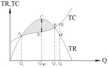 При объеме производства от Q1 до Q2 фирма будет иметь положительную прибыль (заштрихованный сегмент), при этом максимума прибыли она достигнет в точке Qopt. При объеме производства товара, равном Q3, фирма получит отрицательную прибыль (убыток), поскольку на отрезке EF валовые издержки больше валового дохода (TС > TR). Объемы производства Q1 и Q2 принято называть критическими точками, поскольку именно в них совершается переход от убыточного производства к прибыльному производству, и наоборот (рис. 8.5). В управлении предприятием они играют большую роль.
