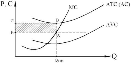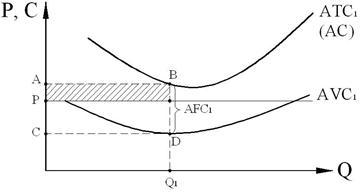 Рис. 8.6. Минимизация убытков [3] При выпуске Q1 единиц продукции убытки фирмы будут равны потерям на одну единицу продукции (ATC1 – Р), умноженным на Q1: (ATC1 – Р)× Q1. Убытки равны площади заштрихованного прямоугольника, и она значительно меньше площади прямоугольника ABCD, соответствующей сумме постоянных издержек: FC = AFC1×Q1. Следовательно, фирма будет продолжать выпускать продукцию, терпя убытки, но стараясь их минимизировать. Третий вариант поведения фирмы– прекращение производства –реализуется в том случае, когда рыночная цена продукции устанавливается ниже минимального значения средних переменных издержек