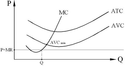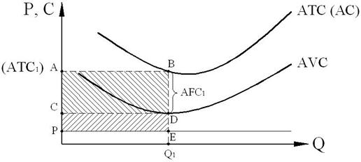 При объеме производства Q1 величина убытков равна площади прямоугольника (ABEP): (ATC1 – P) × Q1. Постоянные издержки фирмы при этом равны площади прямоугольника (ABDC): FC = AFC1 × Q1. Площадь прямоугольника CDEP – это чистые убытки фирмы вследствие непрекращения производства. Их можно избежать, только остановив выпуск продукции. Вместе с тем прекращение производства может быть временным, пока цена не поднимется до уровня, при котором хотя бы покрывались средние переменные издержки, либо фирма убедится в долгосрочном характере понижения цены и тогда уйдет с рынка.