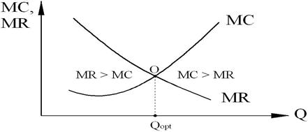 Выбор принципиального варианта поведения фирмы (максимизация прибыли, минимизация убытков, временное прекращение производства) – это первый шаг в оптимизации положения фирмы на рынке. Фирма может сравнить между собой валовой доход TR и валовые издержки ТС (рис. 8.4), но более точным способом определения оптимального размера производства является сравнение предельного дохода MR и предельных издержек МС). Увеличение выпуска продукции повышает прибыль только в том случае, если доход от продажи дополнительной единицы продукции превышает издержки производства данной единицы, то есть если MR > MC. И наоборот, когда издержки, связанные с выпуском еще одной единицы продукции выше дохода от ее реализации (MR < MC), то фирма, произведя дополнительную единицу товара, сократит свою прибыль, то есть увеличит убытки (рис. 8.8).