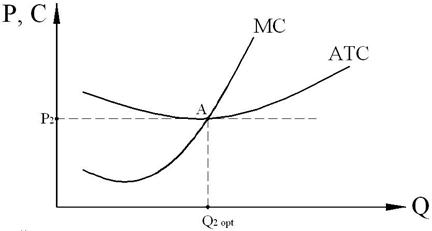 В данном случае любой объём производства вызывает убытки, поскольку средние общие издержки (АТС) сильно превышают установившуюся цену Р. Правильный выбор в этом случае фирма сделает, если остановит производство товара.
