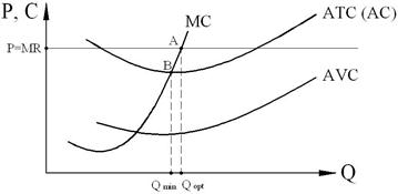 В точке B, где МС = АТС, фирма достигает технологического оптимума производства, которому соответствует Qmin. Но при соблюдении условия максимизации прибыли MR = МС пересечение кривых предельного дохода и предельных издержек будет в точке A, которой соответствует размер производства Qopt, приносящий максимум прибыли. В точке Qmin достигается максимальная прибыль в расчёте на одну единицу продукции. Однако фирма максимизирует не прибыль на единицу продукции, а валовой объём прибыли от всего производства. Если фирма минимизирует убытки (рис. 8.13), то она ориентируется на правило: MR = МС и избирает объём производства, равный Qopt, несмотря на то, что этот объем меньше технологического уровня Qmin.