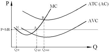 Рис. 8.13. Минимизация убытков [3] При пониженном уровне цены, когда она находится ниже точки безубыточности (т. B), достижение технологического оптимума для фирмы (Qmin) становится проблематичным. Кривые MR и МС имеют две точки пересечения: N и A, но правило MR = МС относится только ко второму пересечению в точке A, где Qopt. Дело в том, что после точки N и достижения соответствующего ей объёма производства QN предельный доход начинает превышать предельные издержки. А когда MR > MC, то фирме следует наращивать объём производства до точки A, которой соответствует Qopt .. Когда фирма прекращает или приостанавливает производство