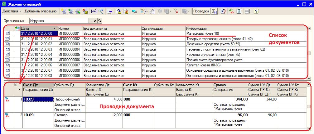 Все введенные операции поступают в Журнал операций (вызывается из меню Операции > Журнал операций). В нижней части журнала операций показываются проводки, сформированные выделенным документом (рис.4.26). Обратите внимание, что для соблюдения принципа двойной записи в документах по вводу входящих остатков бухгалтерские счета корреспондируют со счетом 000. Этот счет специально введен в системе «1С» в План счетов для организации ввода входящего сальдо, он так и называется «Вспомогательный счет».