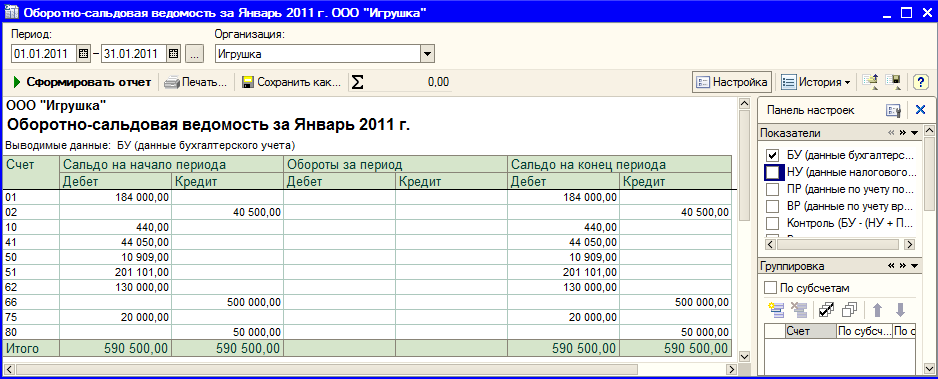 Для проверки правильности введенных данных сформируйте Оборотно-сальдовую ведомость за январь 2011 года (меню Отчеты > Оборотно-сальдовая ведомость). Если вспомогательного счета 000 в этом отчете нет, значит, все введено верно и можно приступать к операциям текущего периода.