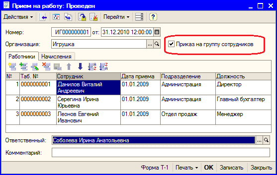 Документ содержит две табличные части - работники и начисления. В табличной части «Работники» путем выбора из справочника «Физические лица» указываются лица, принимаемые на работу, дата приема на работу, присвоенный табельный номер, а также подразделение, в которое сотрудник принимается на работу, и должность.