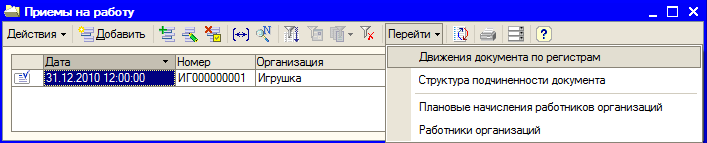 Рис. 8.15. Движения документа «Прием на работу в организацию» по регистрам