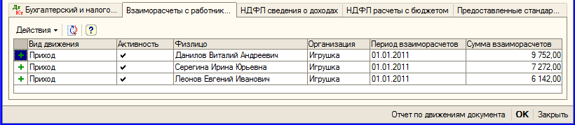Рис. 8.20. Регистр «Взаиморасчеты с работниками организаций» Проверить предоставленные стандартные вычеты по НДФЛ можно, открыв одноименную закладку (рис.8.21)