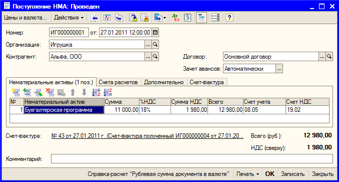 Рис. 9.19. Документ «Поступление НМА»