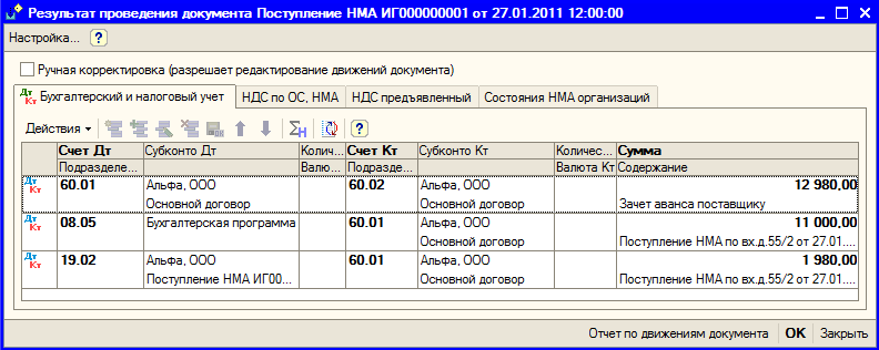 Рис. 9.20. Проводки документа «Поступление НМА»