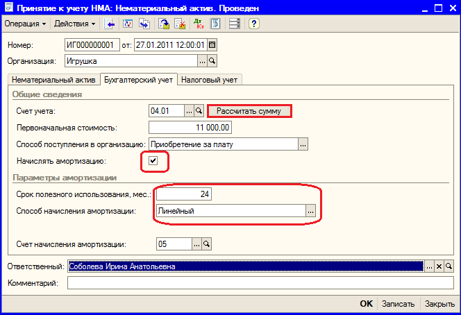 На закладках «Бухгалтерский учет» и «Налоговый учет» первоначальная стоимость нематериального актива заполняется автоматически по кнопке «Рассчитать сумму» (рис. 9.22, 9.23)