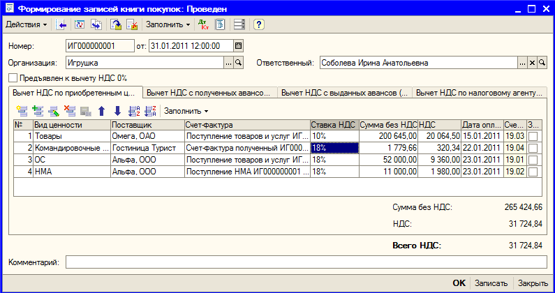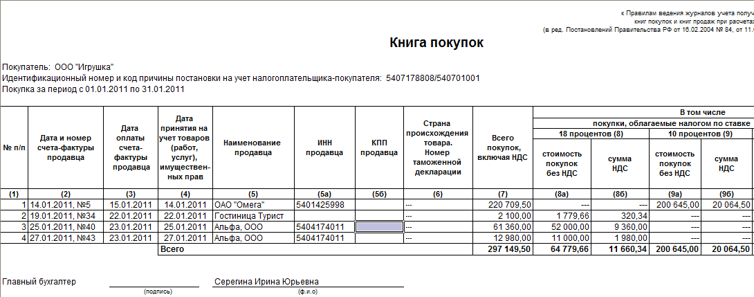 После того, как сформированы записи и проводки, можно сформировать и напечатать отчет «Книга покупок» (вызывается из меню Покупка > Ведение книги покупок > Книга покупок или Помощник по учету НДС (рис. 10.1, 10.4).