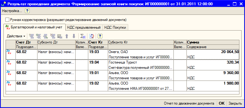 Рис. 10.3. Проводки документа «Формирование записей книги покупок»