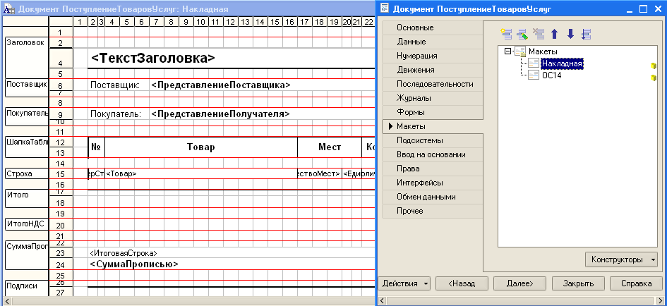 Рис. П2.9. Макет печатной формы документа «Поступление товаров и услуг» в Конфигураторе