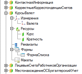Система поддерживает режим автоматической нумерации документов, при котором она самостоятельно может генерировать номер для нового документа. Кроме этого система позволяет осуществлять контроль уникальности номеров документов, не разрешая создавать документы с одинаковыми номерами Регистры сведений предназначены для хранения многомерных сведений о значениях различных величин. Такими значениями могут быть, например, курсы валют или цены на товары конкурентов по состоянию на определенную дату. Эта информация может быть как статической, так и изменяющейся с течением времени - в этом случае для нее предусмотрено хранение истории изменений. Информация в регистре сведений хранится в виде записей, каждая из которых содержит значения измерений и соответствующие им значения ресурсов. Измерения регистра описывают разрезы, в которых хранится информация, а ресурсы регистра непосредственно содержат хранимую информацию. Например, для регистра сведений «Курсы валют» предусмотрено одно измерение – Валюта и два ресурса – курс и кратность, а в регистре сведений «Ответственные лица организаций» - два измерения и два ресурса (рис. П2.11). В каждом регистре сведений должен быть хотя бы один ресурс.