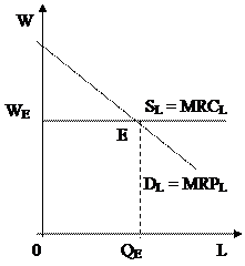 Уровень W определяется в результате конкурентного взаимодействия рыночного спроса и рыночного предложения труда и является заданной величиной для отдельной фирмы. В силу этого предложение труда для нее совершенно эластично, а MRCL = W. Фирма максимизирует прибыль, нанимая работников QE до равенства: MRPL(P × MP) =