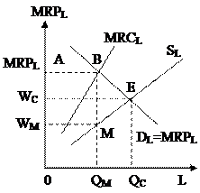Фирма сокращает число нанимаемых работников и устанавливает Wm на более низком уровне, чем в условиях совершенно конкурентного рынка труда WC. При этом Wm < MRP.