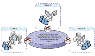Рисунок 4.4 – Использование сети Интернет в качестве транспортной среды К недостаткам такой сети можно отнести невысокую надежность и безопасность, отсутствие гарантированной скорости передачи данных. Объединение локальных сетей предприятия в единую корпоративную сеть на основе арендованных каналов передачи данных (рис. 4.5) приносит следующие преимущества: - высокое качество предоставляемых каналов передачи данных; - высокое качество предоставляемых каналов передачи данных; - высокий уровень услуг и сервисов, предоставляемых провайдером; - гарантированная скорость передачи данных.