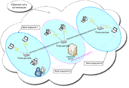 Рисунок 4.5 – Объединение локальных сетей в единую сеть на основе арендованных каналов передачи данных Правильно спроектированная и реализованная корпоративная сеть, выбор надежного и производительного оборудования определяет работоспособность КИС, возможность ее эффективной и длительной эксплуатации, модернизации и адаптации к быстро меняющимся условиям ведения бизнеса и новым задачам. Инфраструктурными составляющими корпоративной сети являются: - кабельная система, образующая физическую среду передачи данных; - сетевое оборудование, обеспечивающее обмен данными между оконечным оборудованием (рабочими станциями, серверами и т.д.). При создании корпоративных сетей главной задачей является построение сетей масштаба здания (локальных) и группы близко расположенных зданий (кампусных), объединение с использованием каналов связи территориально удаленных подразделений. В качестве объединяющего средства может выступать сеть Интернет или городская сеть. При построении локальных и кампусных сетей используются коммутаторы, а при построении территориально-распределенных сетей – маршрутизаторы. Коммутаторы обеспечивают высокоскоростной обмен в рамках локальной сети, передавая информацию только на узлы-адресаты. Коммутаторы оперируют адресами канального протокола, в роли которого, как правило, выступает Ethernet/Fast Ethernet/Gigabit Ethernet, что обеспечивает «прозрачное» функционирование сети, и коммутаторы могут выполнять свои базовые функции без трудоемкого конфигурирования. Маршрутизаторы при передаче информации оперируют логическими адресами – например, адресами протоколов IP, IPX и т.д., что позволяет при обработке ими информации использовать иерархическое представление структуры сети, имеющей значительные масштабы или состоящей из разрозненных и разнородных сегментов. Беспроводные офисные сети служат альтернативой традиционным кабельным системам. Основное отличие их от кабельных систем – данные между компьютерами и устройствами сети передаются не посредством проводов, а по высоконадежному беспроводному каналу. За счет использования беспроводной сети, построенной в соответствии со спецификацией Wi-Fi обеспечивается гибкость и масштабируемость локальной сети, возможность легкого подключения нового оборудования, рабочих мест, мобильных пользователей, вне зависимости от типа используемого компьютера. Применение технологий беспроводных сетей позволяет получать дополнительные услуги: доступ в сеть Интернет в конференц-зале или комнате переговоров, организация Hot-Spot точки доступа и т.д. Преимущества применения беспроводных сетей: - скорость и простота развертывания беспроводной сети; - масштабируемость сети, возможность построения многосотовых сетей; - сохранение инвестиций в локальную сеть при изменении месторасположения офиса; - быстрая реструктуризация, изменение конфигурации и размеров сети; - мобильность пользователей в зоне покрытия сети. На рис. 4.6 представлена офисная сеть, состоящая из нескольких беспроводных сот, в центре которых находятся точки доступа, объединенные единственным проводным каналом или беспроводными мостами. Такая сеть обеспечивает наивысшую производительность, масштабируемость, свободное перемещение пользователей в пределах зон радиовидимости точек доступа. Для организации бе
