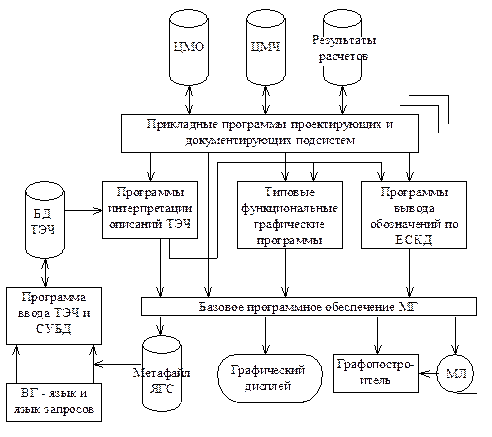 Рис. 40 Для чертежей схем выделяется особый тип изображений параметрических ТЭЧ, графическая часть которых суть ТЭЧ-К или ТЭЧ-М, а параметрами являются текстовые надписи, например текст условной марки ригеля, плиты в монтажных схемах. Выделение ТЭЧ в МГ САПР производится не только по типовым геометрическим формам начертания, но и по семантическому принципу. Принцип состоит в том, что каждому ТЭЧ ставится в соответствие изображение некоторого целостного структурного элемента объекта. Например, деталь в машиностроении, элементы конструкции в строительстве, условные изображения полупроводниковых приборов в радиоэлектронике и т.п. Программные средства базы данных (БД) ТЭЧ обеспечивают: ввод и трансляцию описаний ТЭЧ; запись изображений в БД непосредственно с программ; удаление, замену ТЭЧ; вызов и интерпретацию графических данных с выполнением необходимых преобразований (перенос, поворот, масштабирование) для включения информации в поток данных формирования конкретного чертежа; визуальный контроль изображения ТЭЧ; выдачу различной справочной информации о типе ТЭЧ, масштабе, параметрах управления и порядке из задания. БД ТЭЧ имеют иерархическую и сетевую структуру, которая допускает ссылки на уже существующие в БД типовые изображения. Каждый ТЭЧ формируется и записывается в БД с собственной (локальной) системе координат и имеет одну особую (базовую) точку. Эта точка используется в качестве опорной при выполнении аффинных преобразований над координатами графических элементов, входящих в типовое изображение при установке ТЭЧ в заданную точку конкретного чертежа с требуемой ориентацией. Для описания типовых изображений группы ТЭЧ-П используются специализированные языки высокого уровня, чаще всего процедурные графические расширения традиционных языков программирования. Общая схема программного обеспечения подсистемы выпуска чертежей представлена на рис. 40. Прикладные программы документирования формируют изображения на основе цифровой модели объекта (ЦМО), цифровой модели чертежа (ЦМЧ) или результатов расчета характеристик объекта, требующих графического представления. Представленые на рис. 41 прикладные программы документирования формируют изображения на основе цифровой модели объекта (ЦМО), цифровой модели чертежа (ЦМЧ) или результатов расчета характеристик объекта, требующих графического представления. Характерными компонентами программного обеспечения подсистем автоматизированного выпуска чертежей являются программные средства нанесения различных обозначений и основных надписей согласно стандартам ЕСКД, а также программы функционального уровня, которые реализуют различные элементарные операции, типичные для вычерчивания графических документов. Например, вычерчивание различных криволинейных контуров; штриховка областей, ограниченных контурами различных видов; построение линейных, радиальных, угловых размеров и формирования размерных цепочек. Программы нанесения различных обозначений по ЕСКД обеспечивают: вычерчивание формата и рамки, заполнение основных надписей в штампах, вычерчивание линий сечений и разрезов, линий - выносок, обозначений допусков формы и расположения поверхностей, стрелки - указателя.