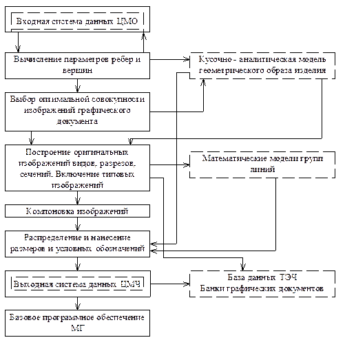 Рис. 42 Графические элементы объединяются в группы и фрагменты. Такое объединение может носить условный характер с целью выполнения совместных операций преобразования и мультиплицирования изображений в диалоговом режиме или нести семантическую нагрузку, т.е. представлять собой узел конструкции. Для обеспечения однозначной связи между графическим изображением и цифровой моделью объекта проектирования группам и фрагментам присваиваются имена (идентификаторы). Уровень графических элементов в модели чертежа представлен простыми графическими элементами (примитивами и некоторыми геометрическими фигурами), ТЭЧ и элементами оформления. Для каждого графического элемента в модели хранится информация о координатах определяющих точек, графических атрибутах и специфических для конкретного элемента неграфических данных, принадлежности к определенному слою чертежа и уровню детализации при выводе. Под слоем понимается самостоятельная поименованная часть модели чертежа, изображение которой при выводе перекрывается с остальными частями чертежа. В любой момент сеанса работы возможно отображение на экране графического дисплея одного, нескольких или всех слоев одновременно. По способам формирования ЦМЧ и ее связи с моделью объекта различают подсистемы графического документирования (ПГД) автономного, неавтономного и смешанного применения. ПГД автономного применения работает без непосредственной связи со специализированными подсистемами САПР. ЦМЧ в такой подсистеме формируется на основе трансляции описания чертежа на специализированном ВГ -языке, например диалоговом графическом языке компоновки чертежа на экране дисплея. Такие подсистемы получили название чертежные системы и нашли распространение при автоматизации проектирования топологии печатных плат, несложных машинно - строительных деталей и т.п. В ПГД с неавтономным и смешанным режимами работы ЦМЧ формируется автоматически на основе ЦМО. Эти режимы являются наиболее эффективными и технологичными для САПР. Программы формирования ЦМЧ в значительной степени зависят от особенностей объекта проектирования и видов чертежей, которые используются для его графического представления. Это могут быть: конструкторские чертежи, строго пропорциональная (масштабная) графическая модель объекта; чертеж - схема, которая фактически отображает лишь структуру и состав объекта; смешанное представление объекта на чертеже или масштабные схемы, например монтажные схемы раскладки плит перекрытий, колонн и ригелей в рабочих чертежах каркасных зданий или планы размещения технологического оборудования. В чертежах смешанного представления объекта строго соблюдаются координаты и метрика взаимного расположения элементов, но сами элементы изображаются в упрощенном (схематическом) виде. Каждый тип чертежа характеризуется составом изображений и некоторыми особыми правилами выполнения. На рис. 43 приведена блок - схема программных средств преобразования моделей изделия в модель графического документа и вывода чертежей в области машиностроения.