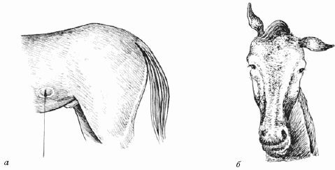Рис. 28. Случная болезнь у лошади: а – «талерная бляшка» на животе; б – паралич лицевого нерва