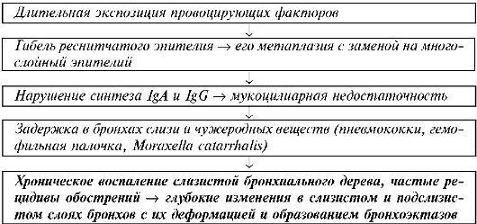 Под влиянием причинных и предрасполагающих факторов происходит истощение местных и системных механизмов саногенеза, включающих кашлевой рефлекс, мукоцилиарный клиренс, активность альвеолярных макрофагов, лизоцим, интерферон, сурфактант, IgA, IgG и др. При ХБ в процесс вовлекаются крупные и средние бронхи. Основные этапы патогенеза могут быть представлены следующим образом: