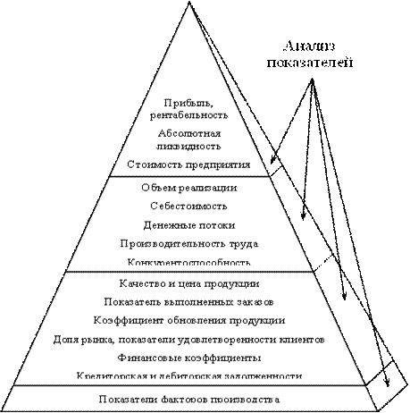 Современная концепция управления эффективностью бизнеса (Business Performance Management, BPM) предусматривает использование сбалансированной системы показателей и выделение ключевых показателей эффективности. Сбалансированная система показателей ССП, (Balanced ScoreCard, BSC) направлена на достижение целей предприятия в соответствии со стадией его жизненного цикла и должна учитывать согласование интересов работников самого предприятия и хозяйствующих субъектов, взаимодействующих с ним [11]. Принцип балансировки предусматривает объединение данных показателей в единую математическую модель. Следует отметить, что так называемая «Панель управления менеджера» (dashboard) должна содержать небольшое количество показателей (5–6), чтобы сконцентрировать внимание менеджера на ключевых показателях эффективности (Key Performance Indicator, KPI). В тоже время информационная система должна обеспечивать возможность раскрытия любого ключевого показателя в виде детализирующих составляющих. Направления формирования сбалансированной системы показателей включают финансовый аспект, внутренние бизнес – процессы, взаимоотношения с клиентами, инновации и перспективы роста сотрудников. Детализация путей формирования сбалансированной системы показателей представлена на рис. 1.9. Следует отметить, что представленная схема носит рекомендательный характер и может быть модифицирована для конкретного хозяйствующего субъекта. Пример иерархически взаимосвязанной системы основных показателей информационной поддержки управления представлен на рис. 1.10. Показатели, представленные на рис. 1.10 сгруппированы по четырем уровням иерархии. Первый уровень содержит основные показатели, обобщающие производственно - хозяйственную деятельность предприятия. Их значения раскрываются показателями последующих уровней. Нижний, четвертый, уровень иерархии содержит большое количество показателей, сгруппированных по факторам производства. Показатели факторов производства представлены в табл. 1.1. [29].