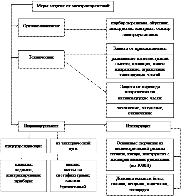 Электробезопасность в производственных условиях обеспечивается соответствующей конструкцией электроустановок, техническими способами и средствами защиты, организационными и техническими мероприятиями. От случайного прикосновения к токоведущим частям защищают следующие меры и технические средства: защитные оболочки и ограждения; безопасное расположение токоведущих частей; изоляция рабочего места; предупреждающая сигнализация и знаки безопасности; изоляция (рабочая, двойная); блокировки (механические, электрические, фотоэлектрические) и пр. Для защиты от прикосновения к нетоковедущим частям, которые могут оказаться под напряжением, служат следующие меры и технические средства; защитное заземление и зануление; защитное отключение; малое напряжение; средства индивидуальной защиты (рис. 8.9).